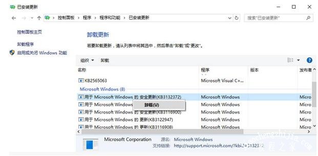 4. 在列表中,找到名为【KB3132372】的更新,右键选择【卸载】