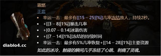如果玩家自带冰霜技能,霜燃可以帮助玩家实现“永冻”效果,如果玩家没有冰霜技能,霜燃也能附带不错的控场效果。而且霜燃还附带幸运一击回能,一件又能控场又又能回能的装备,绝对是前期必备。