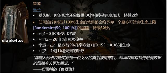 它全面提升了药水效果,首先是药水数量+3,然后是药水掉率加20%,药水还能提供移动速度和额外的屏障,可以说这件裤子把药水流玩到了极致。