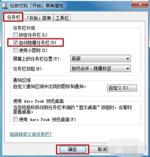 接着在打开的“任务栏”选项卡中,取消勾选“隐藏任务栏”项并点击“确定”按钮。