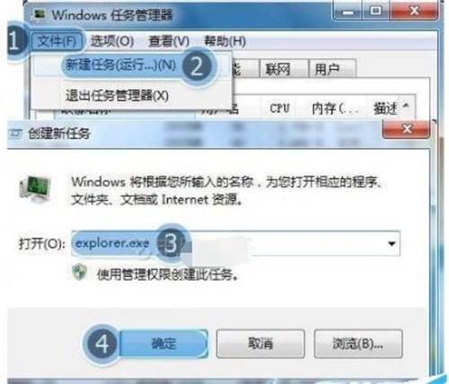 再点击【文件】→【新建任务(运行)】然后输入“explorer.exe”→点击【确定】桌面又回来了: