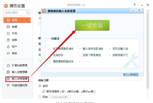 接着在搜狗拼音输入法属性设置的下面找到“输入法修复器”再点击“一键修复”