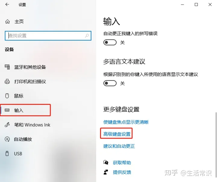 2. 接着,在“设备”窗口中,选择左侧的“输入”,并在右侧中找到且点击“高级键盘设置”