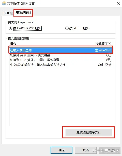 4. 在弹出的“文本服务和输入语言”窗口中,选择“高级键设置”选项卡,在下面找到“在输入语言之间”选项,并点击“更改按键顺序”按钮