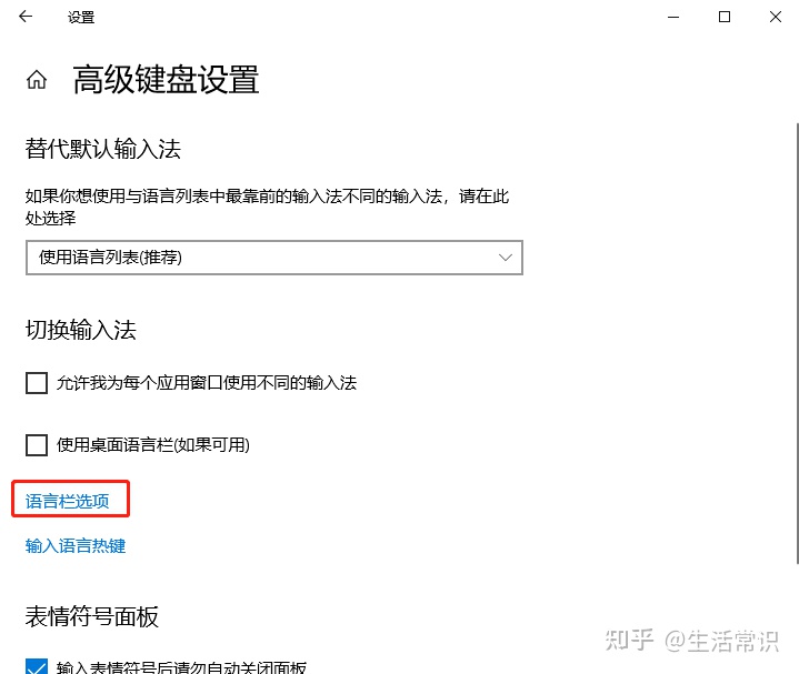 3. 然后,在弹出的“高级键盘设置”窗口中,点击左侧的“语言栏选项”