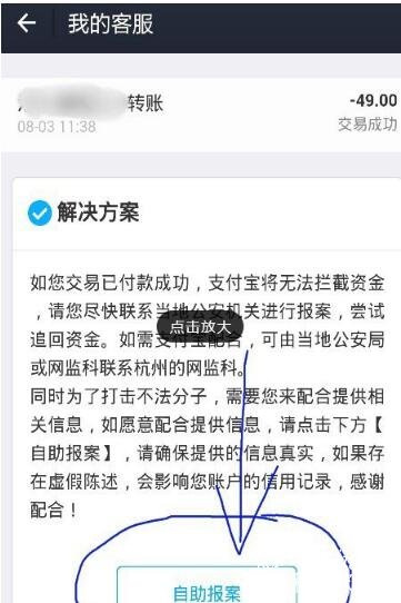 6、选择自己遇到问题的账单后,点击“解决方案”下方的“自助报案”。