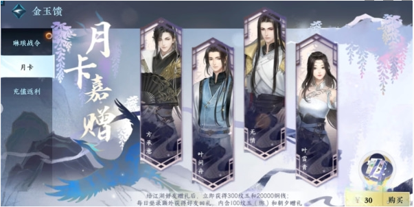 1、月卡购买价格为30元,玩家在购买之后可立即获得300纹玉和20000铜钱奖励。