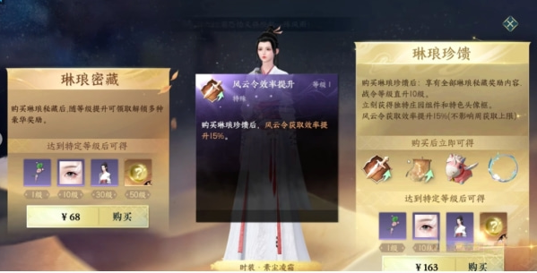 3、升级的战令系统为琳琅密藏(68¥)和琳琅珍馈(163¥),这两个区别在于贵的那个是可以获得多庄园组件和头像框,并提升风云令15%获取概率。