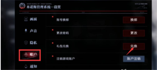 3、然后在设置界面左侧找到账号,在界面点击礼包兑换进入。