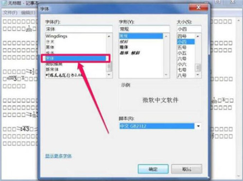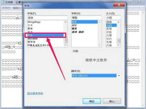 3、将它改为中文字体,大家通常使用的是“宋体”,“新宋体”之类,这里以宋体为例,选择它;如图所示: