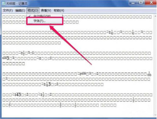 1、遇到这种情况,最先想到的应该是字体设置错误导致,先打开记事本的“格式”菜单,选择“字体”这一项;如图所示: