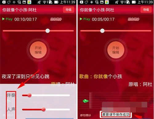 3、根据所需可调节【伴唱】【人声】【美音】,返回可见保存成功字样。
