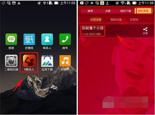1、安装并打开k歌达人,在主界面点击【录歌】进入【我的录音】界面,点击录制好的歌曲。