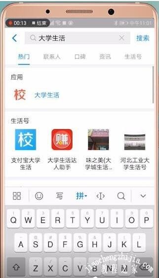 1、首先打开【支付宝】APP,在顶部【搜索栏】搜索“大学生活”
