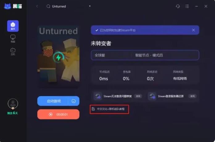 有了加速时长之后我们搜索《Unturned》进行加速,加速完成之后重新进入游戏进行联机