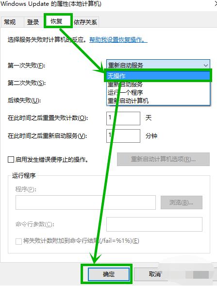 5、再点击【恢复】选项卡,将【第一次失败】改为【无操作】,点击【确定】即可