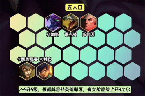2-3升5级,根据阵容补格斗棋子,有女枪换米利欧优先开3比尔吉沃特;