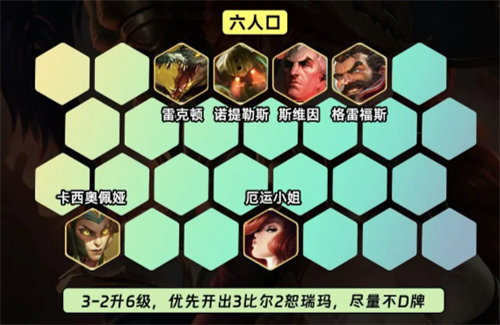 3-2升6级,6级优先开出3比尔吉沃特2司令2恕瑞玛,尽量不D牌;
