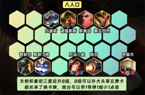 女枪和泰坦三星后升8级,8级可以补大头等五费卡,船长来了之后替换卡牌;