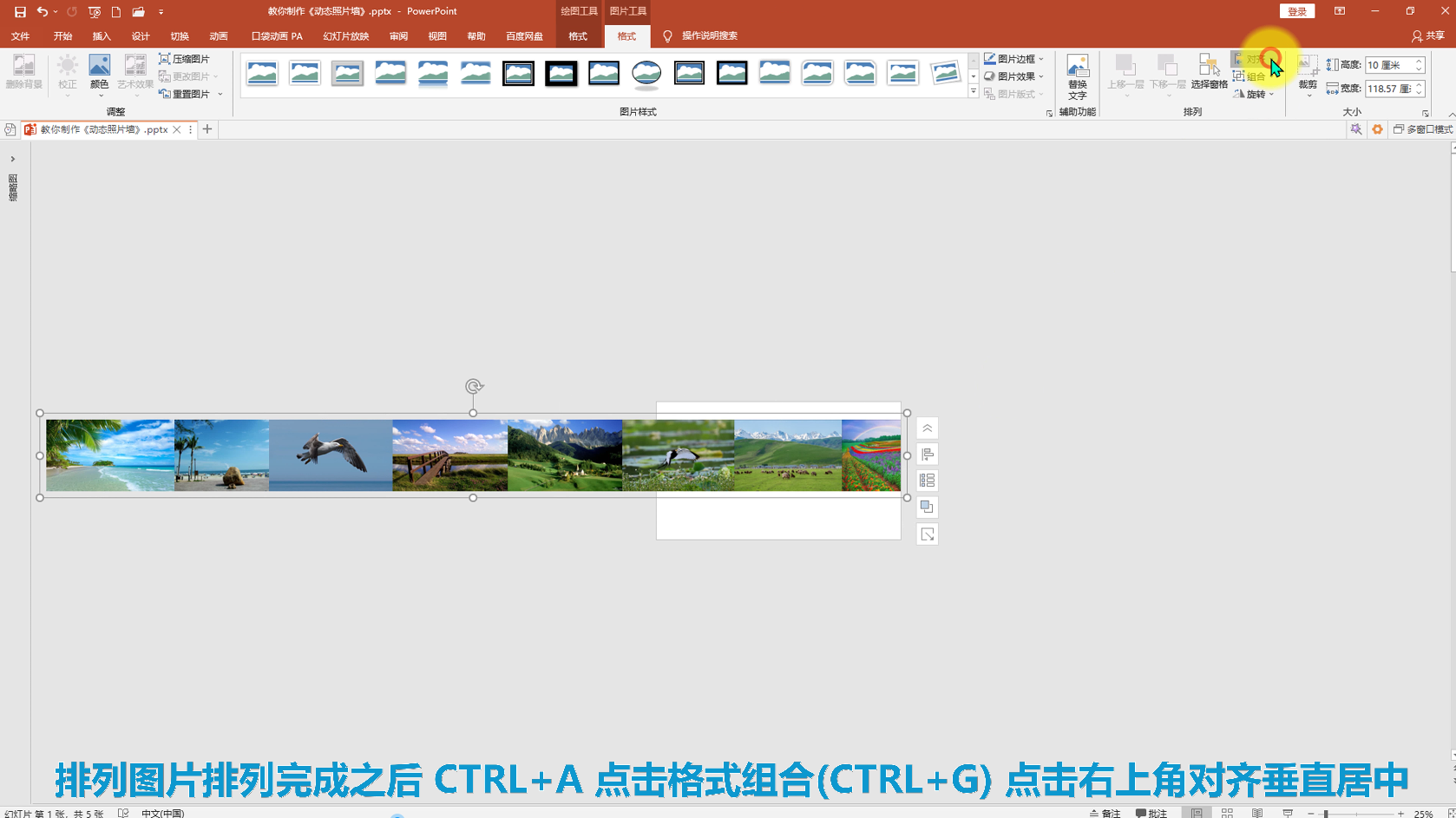 第二步,将调整完的图片依次从左向右排列,中间不留空白,全选ctrl+a,点击工具栏组合或者按快捷键ctrl+g
