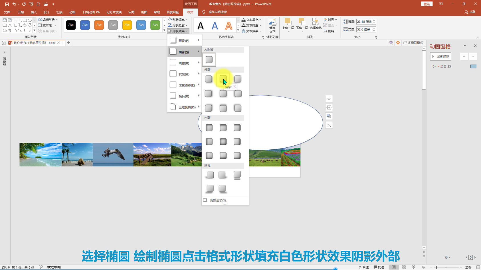 绘制椭圆,填充颜色为白色,设置上面椭圆形状效果-阴影-外部-偏移-下