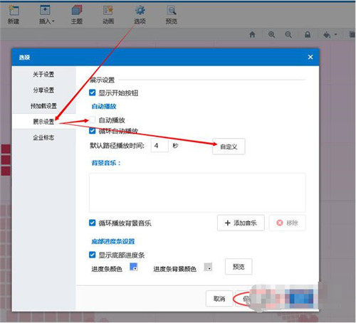 点击工具栏的“选项”,选择“展示设置”,进入设置面板。可以通过勾选来选择“自动播放”或者“循环自动播放”也可以通过“自定义”设置幻灯片播放时间和顺序。设计完毕后,点击“保存”或者“保存为默认值”——方便以后使用。