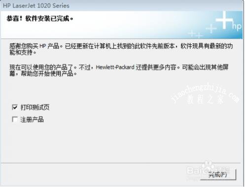 驱动安装完成,屏幕上会出现“恭喜!软件安装已完成”的提示窗口,并在“打印测试页”和“注册产品”两个选项上打了对勾。