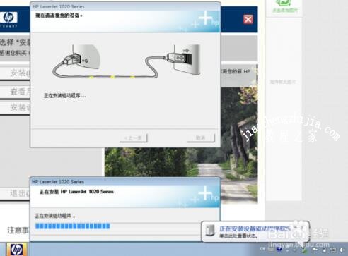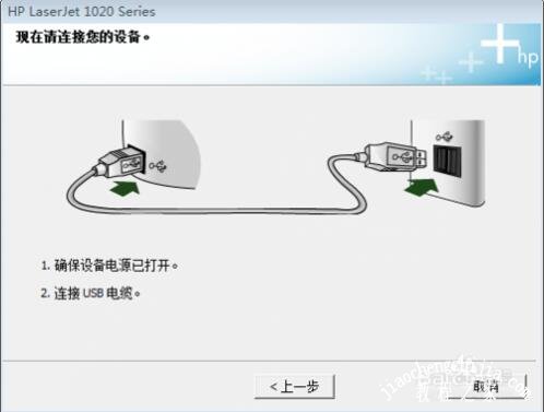 安装程序运行到一定阶段,会弹出连接设备的提示窗口,这时打开惠普 LaserJet 1020 打印机背后的电源开关。
