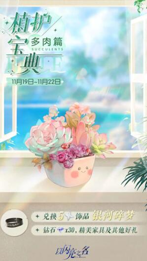 消耗培育次数照料小多肉即有机会获得基础色卡、遇之钥等奖励,累积甘露值还可换取五星颈饰【银河碎梦】、钻石*30、潮流色卡*9及多种材料道具!