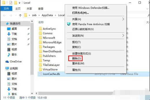 4、在打开的文件夹中,找到Iconcache.db,将其删除;