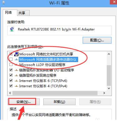 3,在网络设置对话框,找到【Microsoft网络适配器多路传送协议】选择,然后点击左下角【安装】