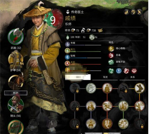 医士主修“人”,所以技能树中拥有所有4个“人”系技能点。“人”系技能点提供5点火和3点木属性,并主要提供行军距离、部队属性的加成,决定了医士主要作为将领而存在;