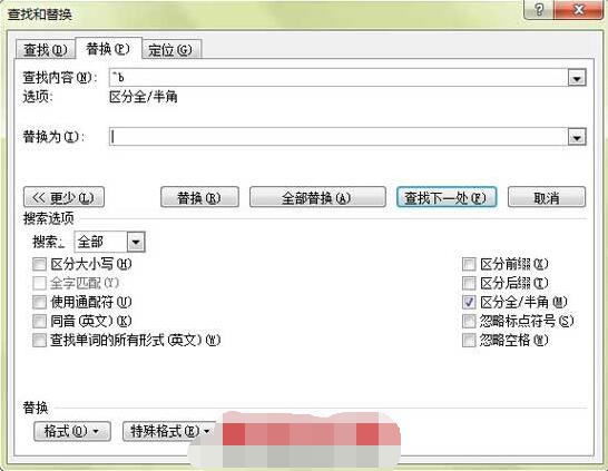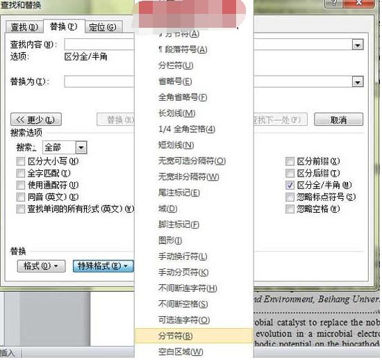 因为批量替换空格等字符可以用过替换来实现,于是想到“可否替换掉分节符呢”。Ctrl+H调出替换对话框,在“特殊格式”里终于找到了分节符,眼看着要大功告成了!