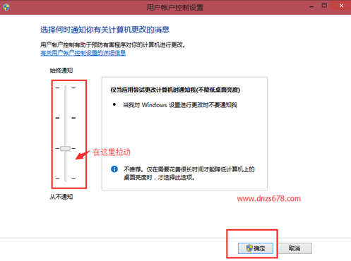 3、win10系统默认是拉到底的,所以在看图片时会提示“在禁用UAC时,无法激活此应用”,这时我们只需要用鼠标把滑块往上拉动即可,拉动时会有提示的,按照您的使用需求拉动。