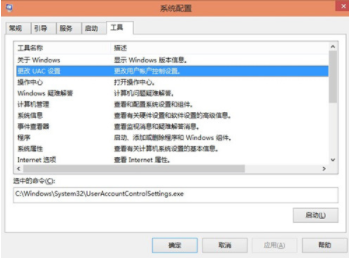 2、进入“系统配置”窗口后,我们很清楚的看到“更改UAC设置”,我们选择后再点击右下角的“启动”按钮。