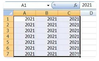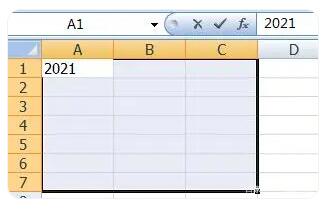 选择单元格区域A1:C7,在活动单元格A1键入“2021”,光标停留在单元格A1不要移开。