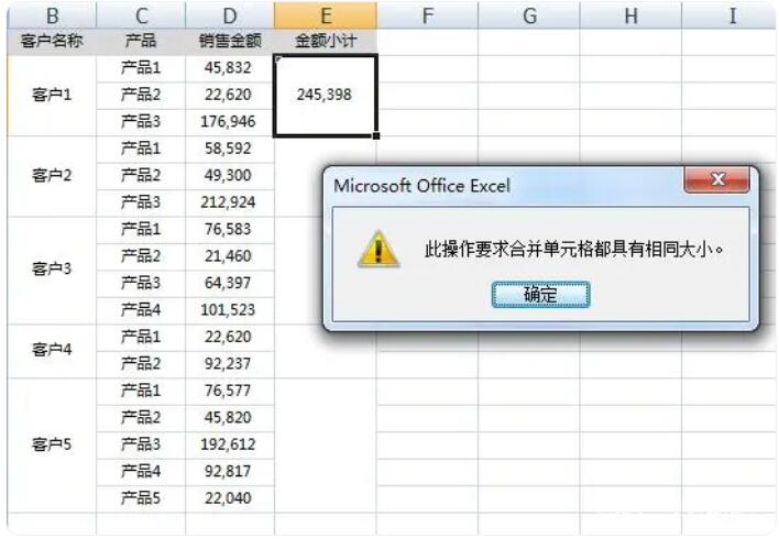 但是,如果碰到不规则的合并单元格,即合并单元格的行数不一致的情况,以上的复制粘贴方法就无效了。譬如,下拉复制合并单元格区域E2:E4的公式,系统会报错。