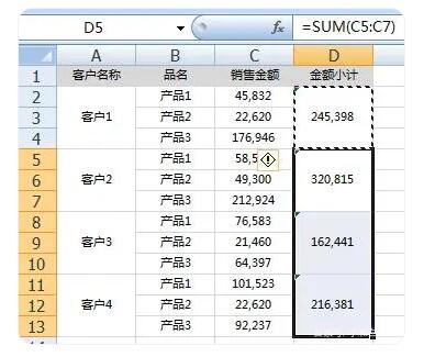 譬如需要计算不同客户的销售小计,在单元格D2即合并单元格区域D2:D4键入公式“=SUM(C2:C4)”,复制该公式,然后选中剩余合并单元格区域D5:D13粘贴或者直接下拉复制即可。