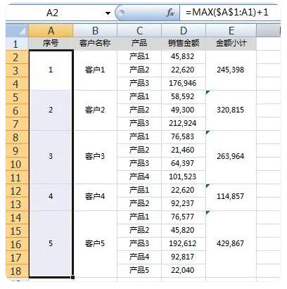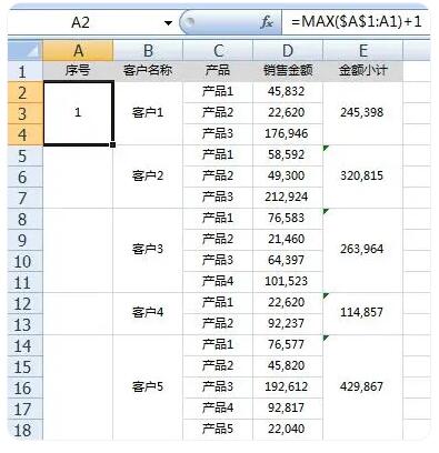 在向下填充的过程中,相对引用“A1”将同时向下移动至下一个合并单元格的上一个地址,所以MAX函数会返回上一个合并单元格的序号,加上“1”,生成新的序号。