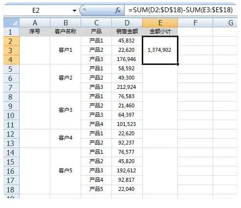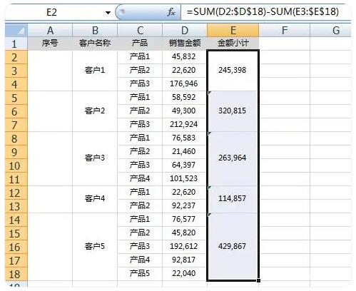 “SUM(E3:$E$18)”统计不包括本合并单元格,仅包括本合并单元格后面的合并单元格的销售金额合计。