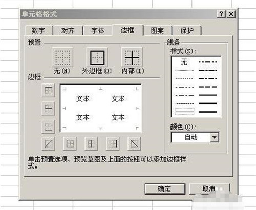 3.在新建excel中,用鼠标选中需要的表格行数列数,然后点右键,“设置单元格格式”——“边框”,在“预置”中根据需要选择“外边框”、“内部”边框。