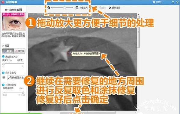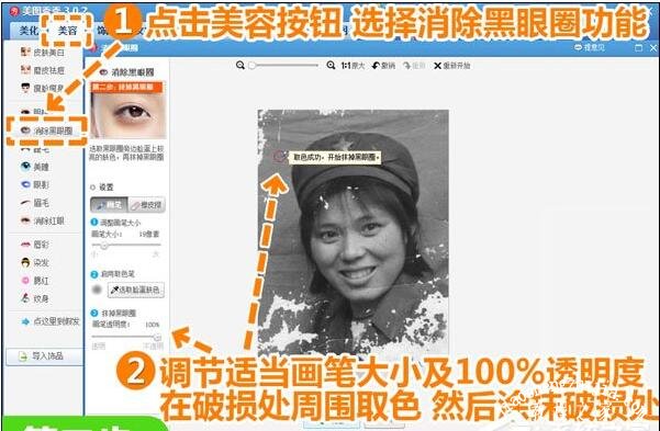 2、接着我们进入“美容”菜单下,选择“消除黑眼圈”功能,将画笔透明度调至100%,然后用适当大小的画笔在破损处周围取色,再涂抹到破损处进行修复处理。