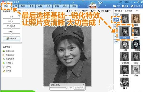 5、最后我们调节照片的清晰度,在“美化”菜单下,选择“基础—锐化”特效,修复旧照片的工程就大功告成啦!