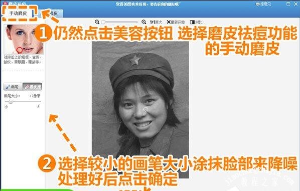 4、然后还在“美容”菜单下,选择“磨皮祛痘”功能,用手动磨皮来降噪,选择合适大小的画笔涂抹脸部,使肤质更加柔和。