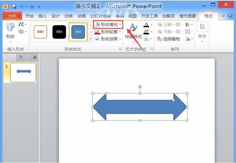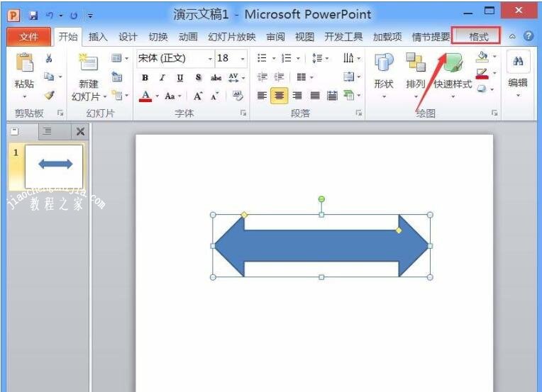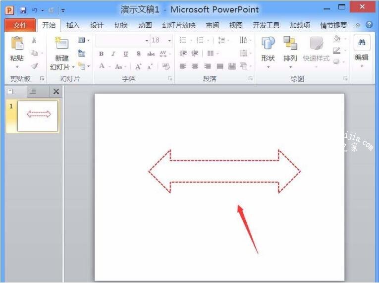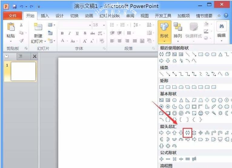 2、在打开的PPT界面内找到开始里的形状选项,点击该选项在内找到箭头总汇里的双向箭头选项,如图所示: