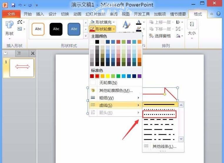 7、再在形状轮廓选项内找到虚线选项,点击虚线选项在其下拉菜单那里找到虚线选项,如图所示: