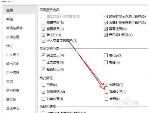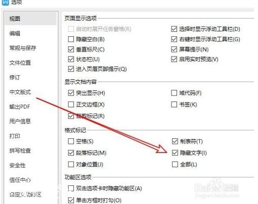 接下来我们在打开的wps2019选项窗口中找到“隐藏文字”选项。