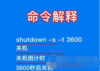 2、shutdown -s -t 3600命令的含义如下:shutdown -s表示关机,shutdown -s -t表示电脑关机倒计时,最后面的数字则表示倒计时时间,单位为秒。也就是说电脑将在3600秒后自动关机;
