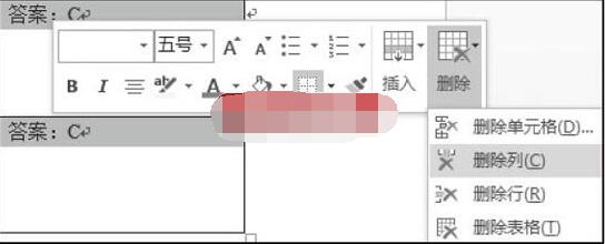 步骤4:利用鼠标选中表格第三列,即答案列。在弹出的快捷菜单中单击“删除”按钮,在下拉列表中单击“删除列”命令,如图5所示,即可将答案列删除。