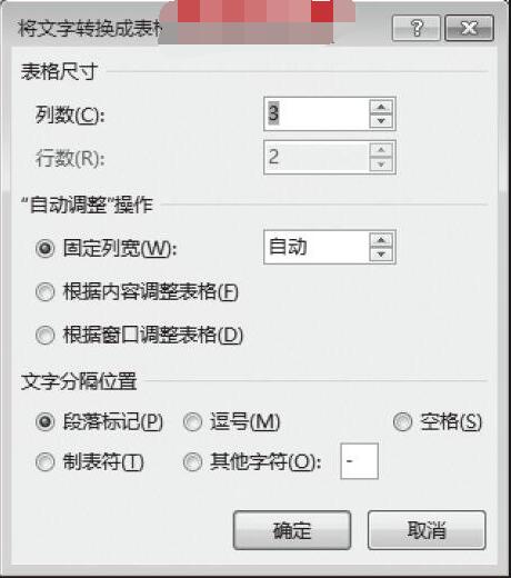 步骤2:弹出“将文字转换成表格”对话框,单击“列数”微调按钮,将“列数”设置为“3”,并在“文字分隔位置”选项栏中选中“段落标记”单选按钮,然后单击“确定”按钮,如图3所示。